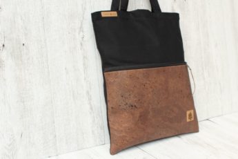 Tote bag aus Baumwolle in SCHWARZ mit einer Reißverschluß-Aussentasche aus Kork-Leder in SCHWARZ.