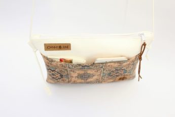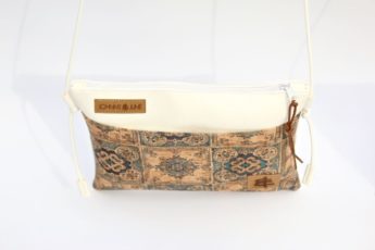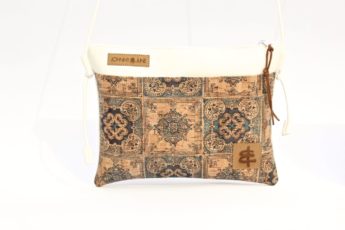 Umhängetasche aus Kunst-Leder in WEISS mit Reißverschluss & 1 Tasche aus Kork-Leder in PORTUGUES auf der Front sowie farblich passende Kordel in Leder-Optik.