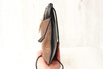Umhängetasche aus Kunst-Leder in SCHWARZ mit Reißverschluss & 1 Tasche aus Kork-Leder in BRAUN auf der Front sowie farblich passende Kordel in Leder-Optik.