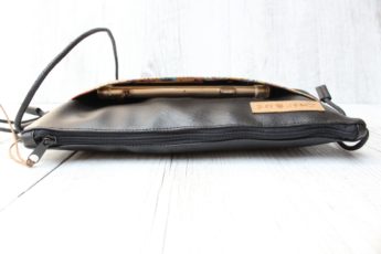 Umhängetasche aus Kunst-Leder in SCHWARZ mit Reißverschluss & 1 Tasche aus Kork-Leder in PRIMAVERA auf der Front sowie farblich passende Kordel in Leder-Optik.